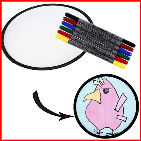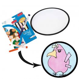 Je kunt er ook voor kiezen om op de frisbee allemaal vakjes te tekenen en die met de textielstiften in te kleuren.