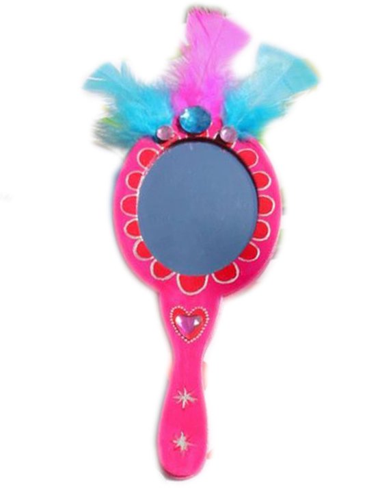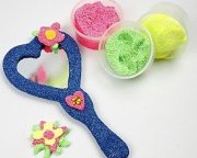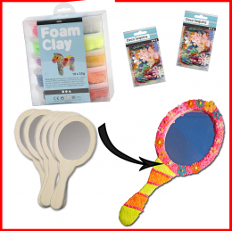 Je kunt de handspiegel ook versieren met foamklei. Deze klei is erg makkelijk in het gebruik. Je drukt kleine stukjes foamklei op de spiegel en het droogt vervolgens aan de lucht. In de klei kun je nog siersteentjes drukken. Ook die blijven vanzelf zitten.