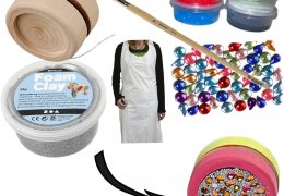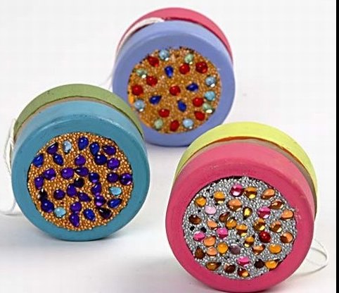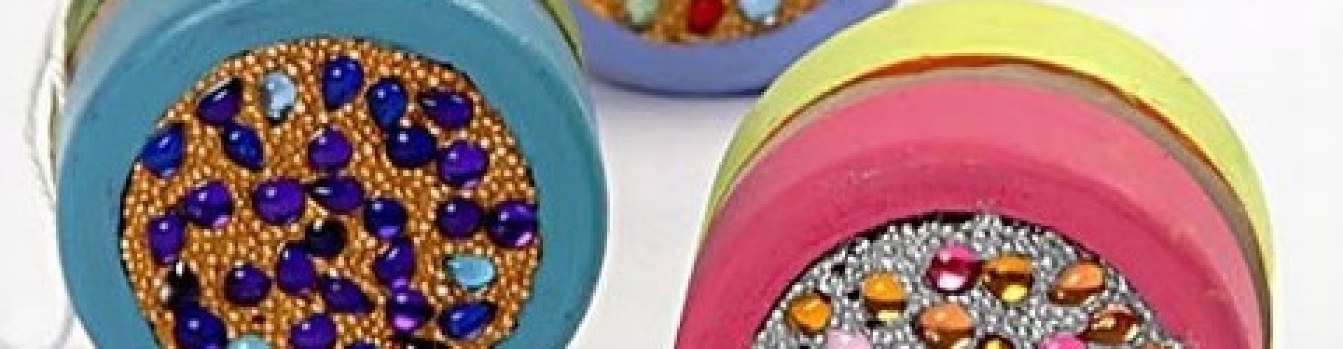 Als de jojo’s droog zijn, zet je de foamklei en de strassteentjes op tafel. De kinderen kunnen foamklei in de holte van de jojo drukken. Zorg dat het gelijkmatig is opgevuld. Nu kunnen de strassteentjes in de natte foamklei gedrukt worden.