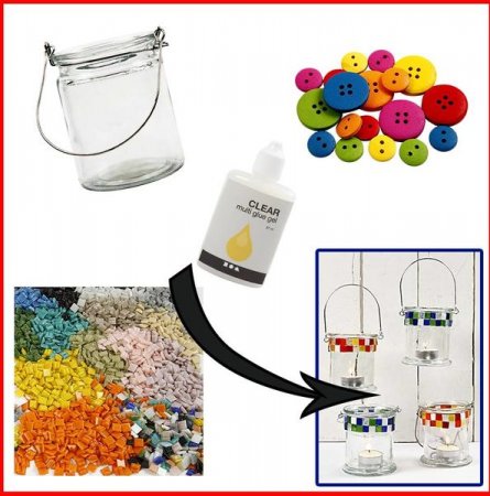Ook glazen potjes kun je met mozaiekstenen beplakken. Dit kun je ook afwisselen met andere dingen als knopen of kralen. Je kunt alles makkelijk met 3d lijm op het glas plakken. Voegen is nu niet nodig. Zo kan het licht nog mooi door de openingen schijnen.