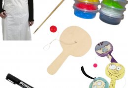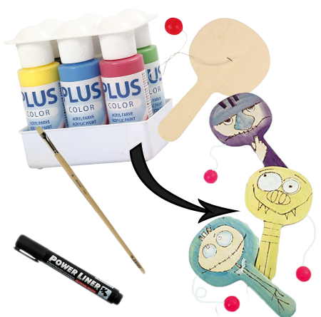 de knutselmaterialen op de tafel. Geef nu ieder kind een tennisbat. Laat het de bat
